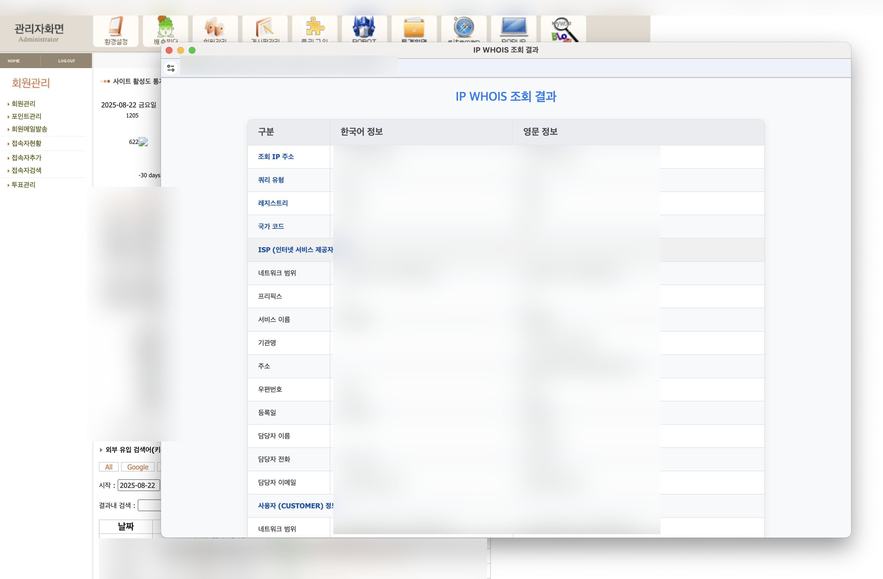 2. 외부 유입 검색어 분석기에서 아이피 아이콘 클릭시 아이피 후이즈 결과 오류 현상 수정해주세요.